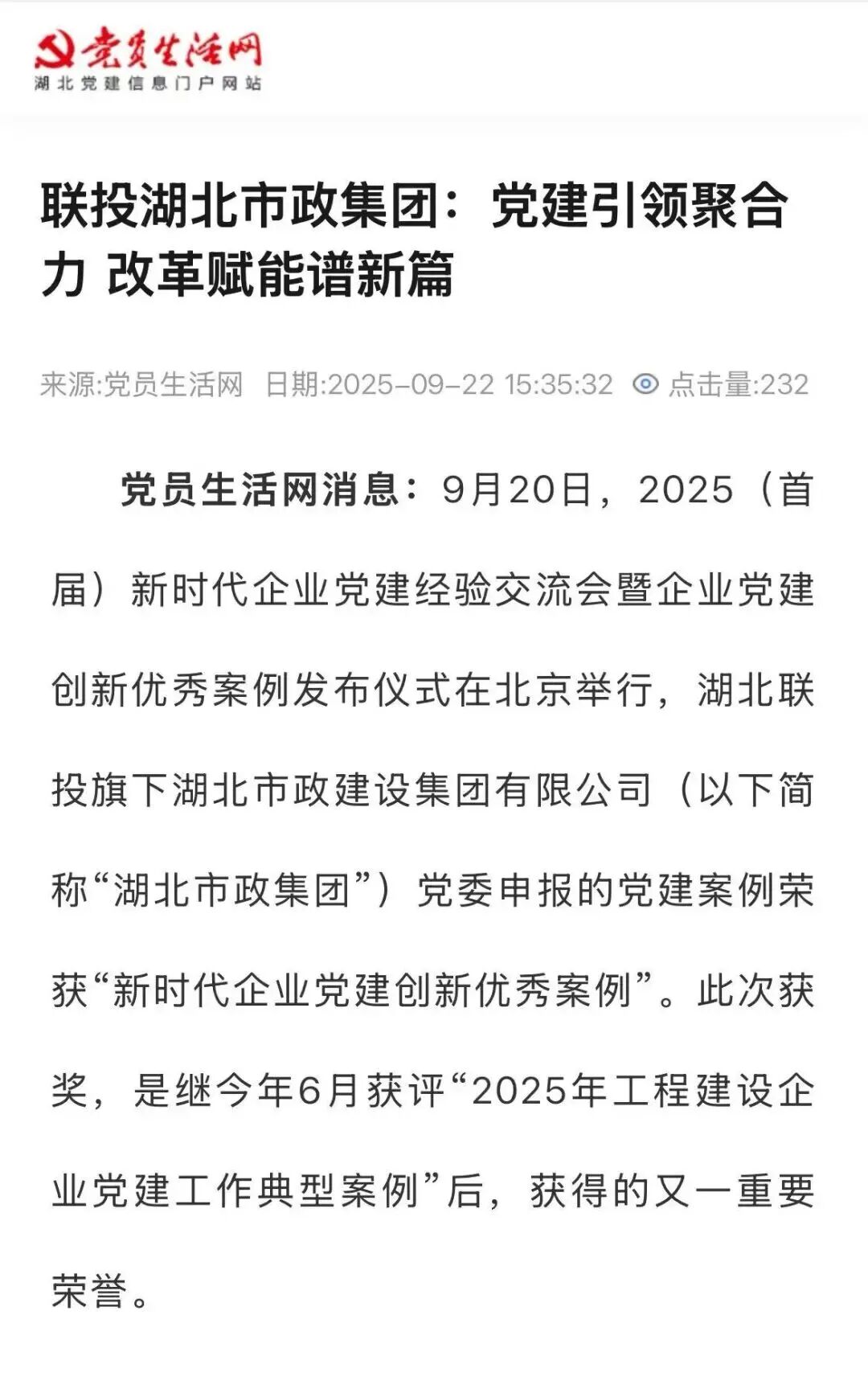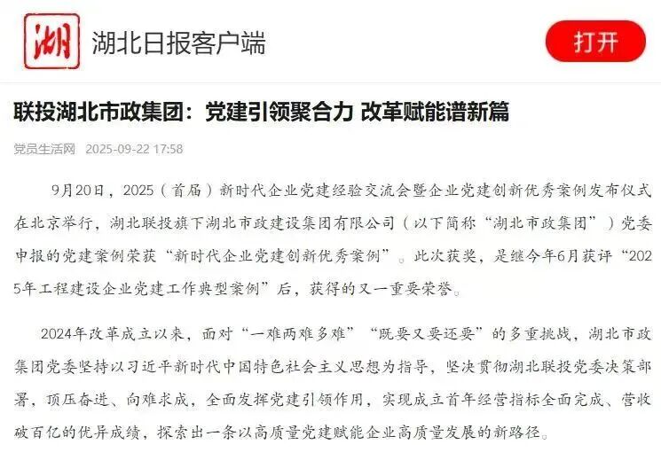 9月20日,2025(首届)新时代企业党建经验交流会暨企业党建创新优秀案例发布仪式在北京举行,pa集团官网旗下湖北市政建设集团有限公司(以下简称“湖北市政集团”)党委申报的党建案例荣获“新时代企业党建创新优秀案例”。此次获奖,是继今年6月获评“2025年工程建设企业党建工作典型案例”后,获得的又一重要荣誉。
