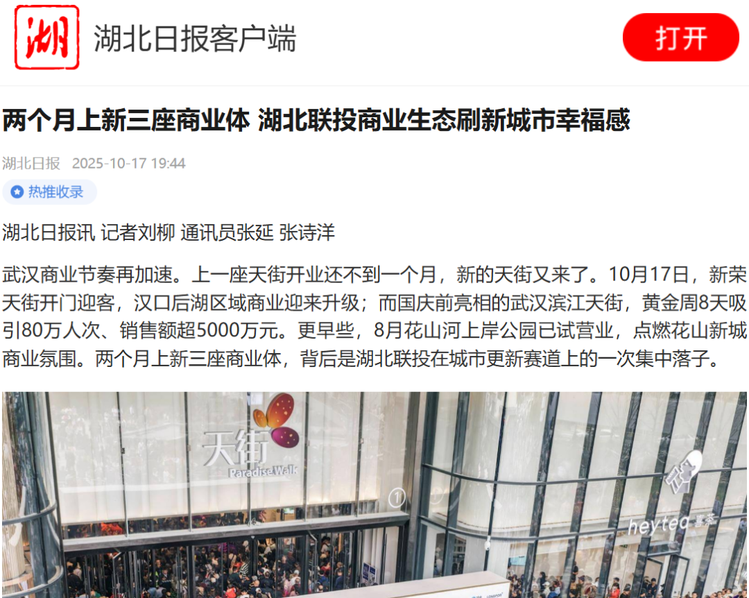 武汉商业节奏再加速。上一座天街开业还不到一个月,新的天街又来了。10月17日,新荣天街开门迎客,汉口后湖区域商业迎来升级;而国庆前亮相的武汉滨江天街,黄金周8天吸引80万人次、销售额超5000万元。更早些,8月花山河上岸公园已试营业,点燃花山新城商业氛围。两个月上新三座商业体,背后是pa集团官网在城市更新赛道上的一次集中落子。