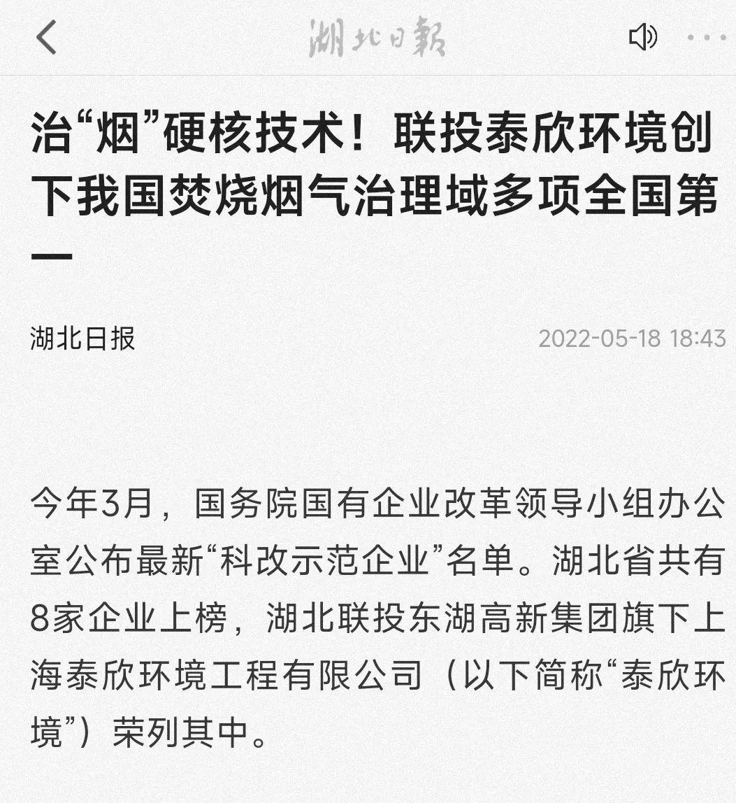 今年3月,国务院国有企业改革领导小组办公室公布最新“科改示范企业”名单。湖北省共有8家企业上榜,东湖高新集团旗下上海泰欣环境工程有限公司(以下简称“泰欣环境”)荣列其中。